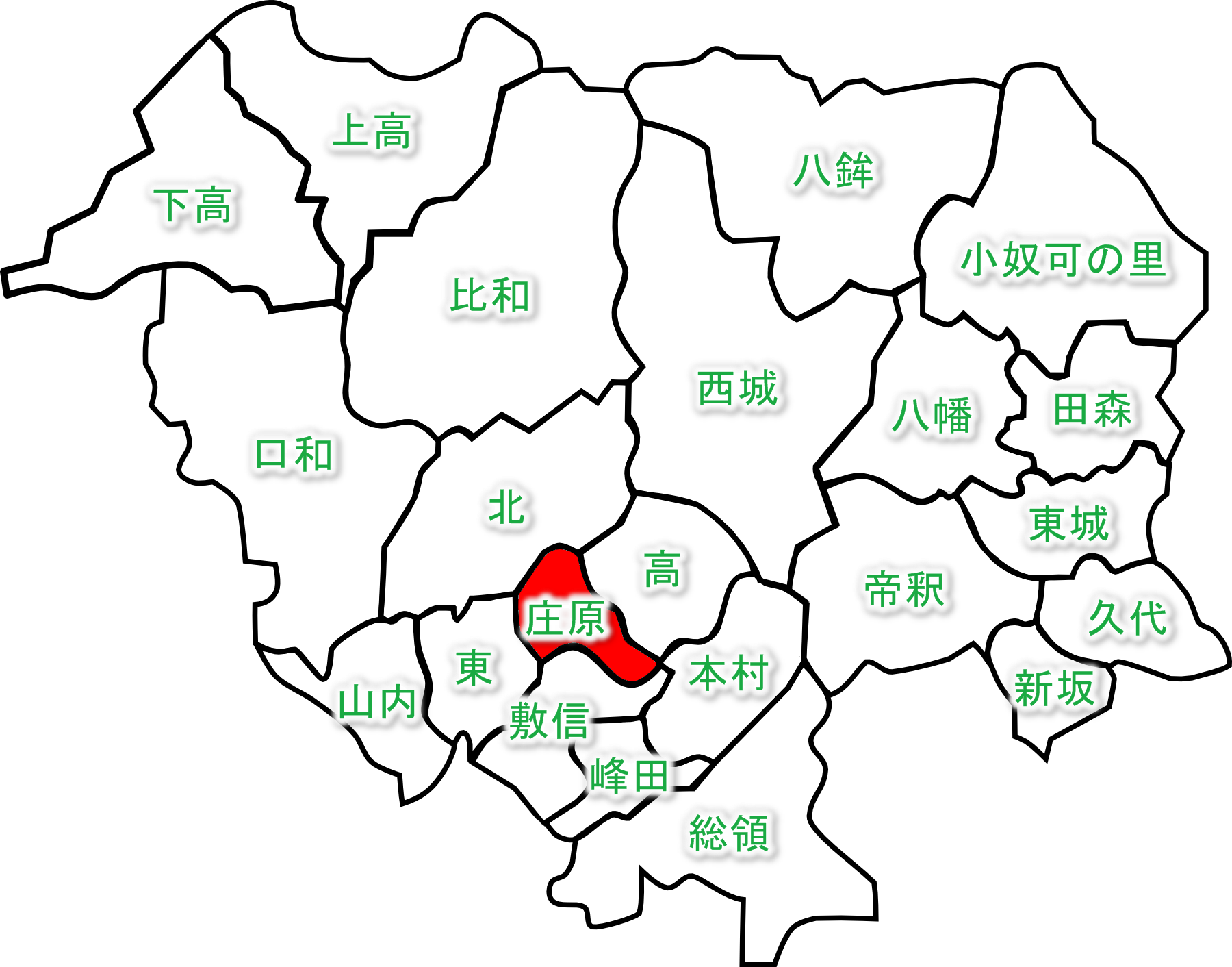 庄原市自治振興区の境界線が引かれただけの白地図です。